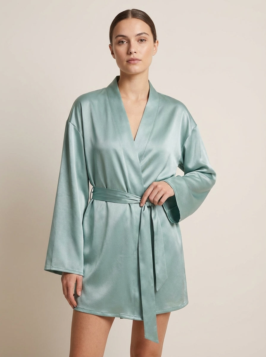 Designed for both comfort and elegance, this kimono-style robe features a flowing silhouette and a sophisticated shawl collar. Its wrap-around (surplice) design and adjustable waist belt create a flattering and comfortable fit.