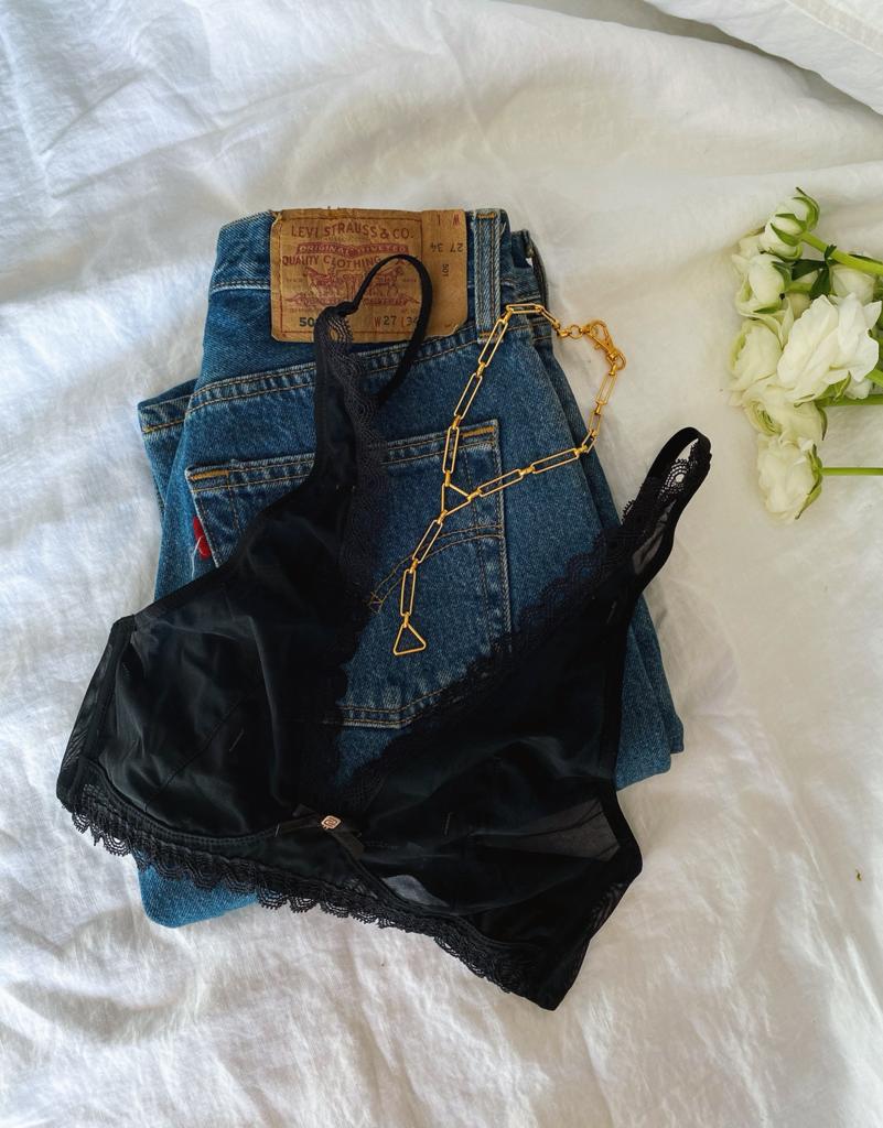 Introducing the Andria Bralette, the epitome of comfort and elegance. Designed without wires or cups, it offers all-day ease without compressing your bust. The sidebands elevate and shape the bust, while the chic pink-gold adjusters add a touch of luxury. Crafted from black delicate tulle, this bralette is an essential addition to your wardrobe. Perfect for everyday wear, it pairs seamlessly with the matching Niki brief. True to size for a flawless fit, it features an elastic underband and bust darts for gentle support. Adjust the straps for your perfect fit and enjoy unparalleled comfort and style.