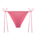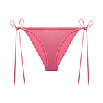 Complementing the eye-catching top, these pink bikini bottoms feature adjustable ties for a perfect fit. The shiny fabric continues, adding a playful sparkle that enhances the allure of the entire look.