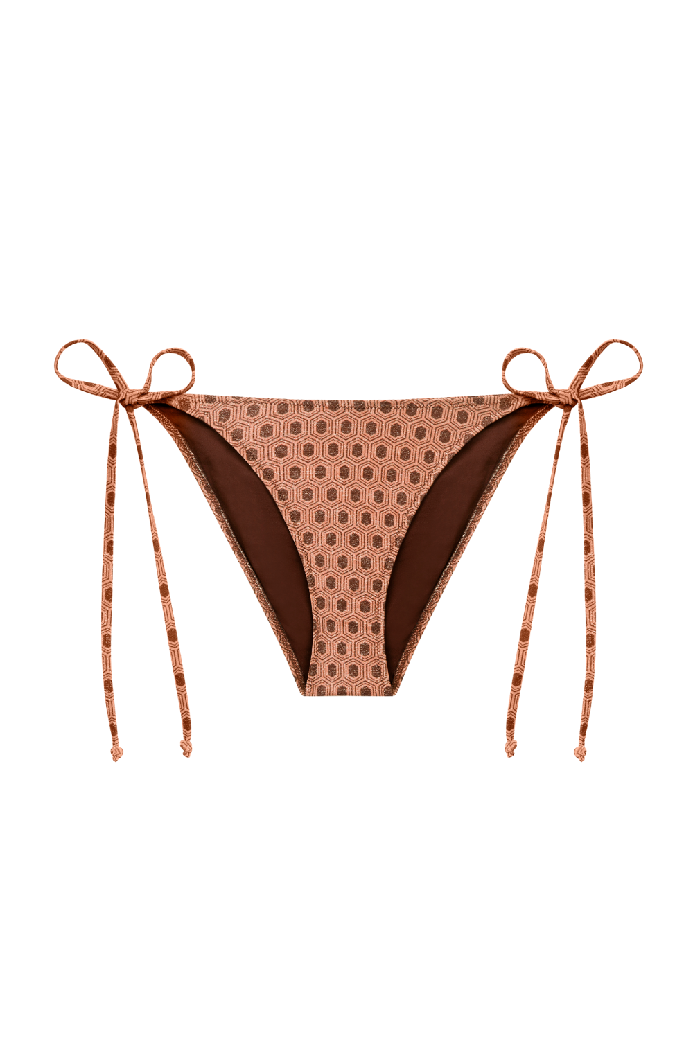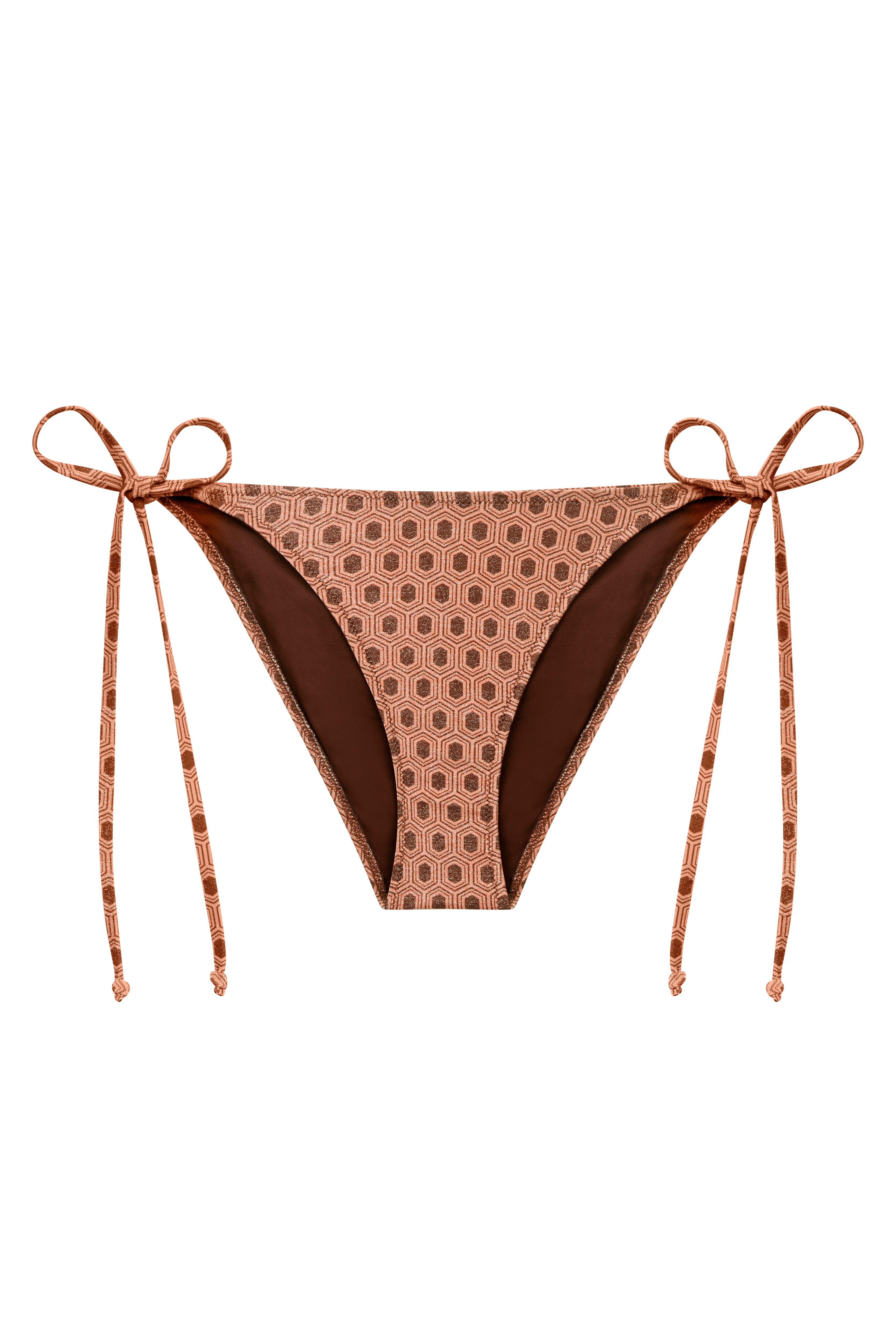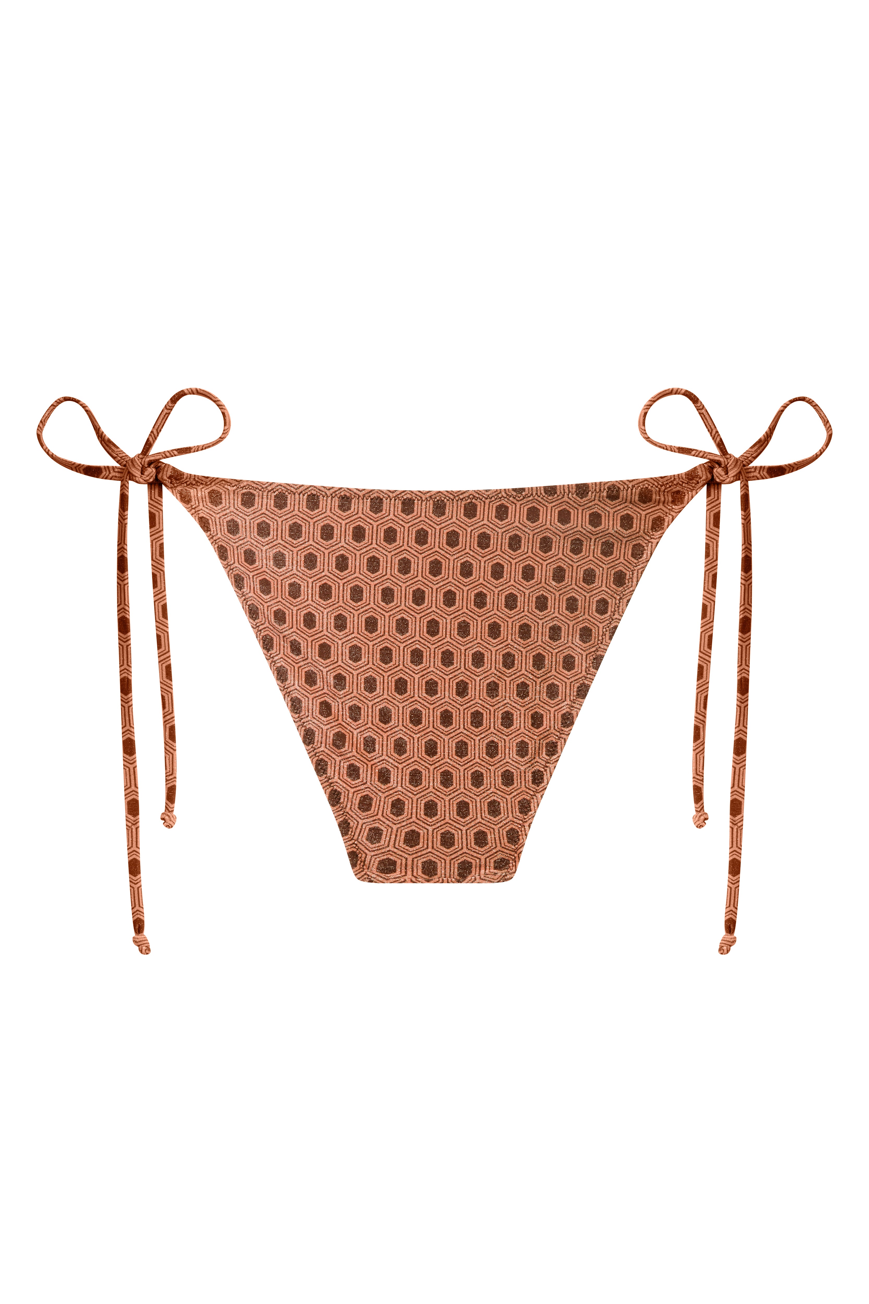 Matching the luminous top, the 'Soul is Golden' bottom wraps around with ease, its side ties dangling like threads of sunlight. The intricate pattern is a subtle nod to the complex depths of the soul, making this bottom a piece that not only flatters but also intrigues.