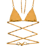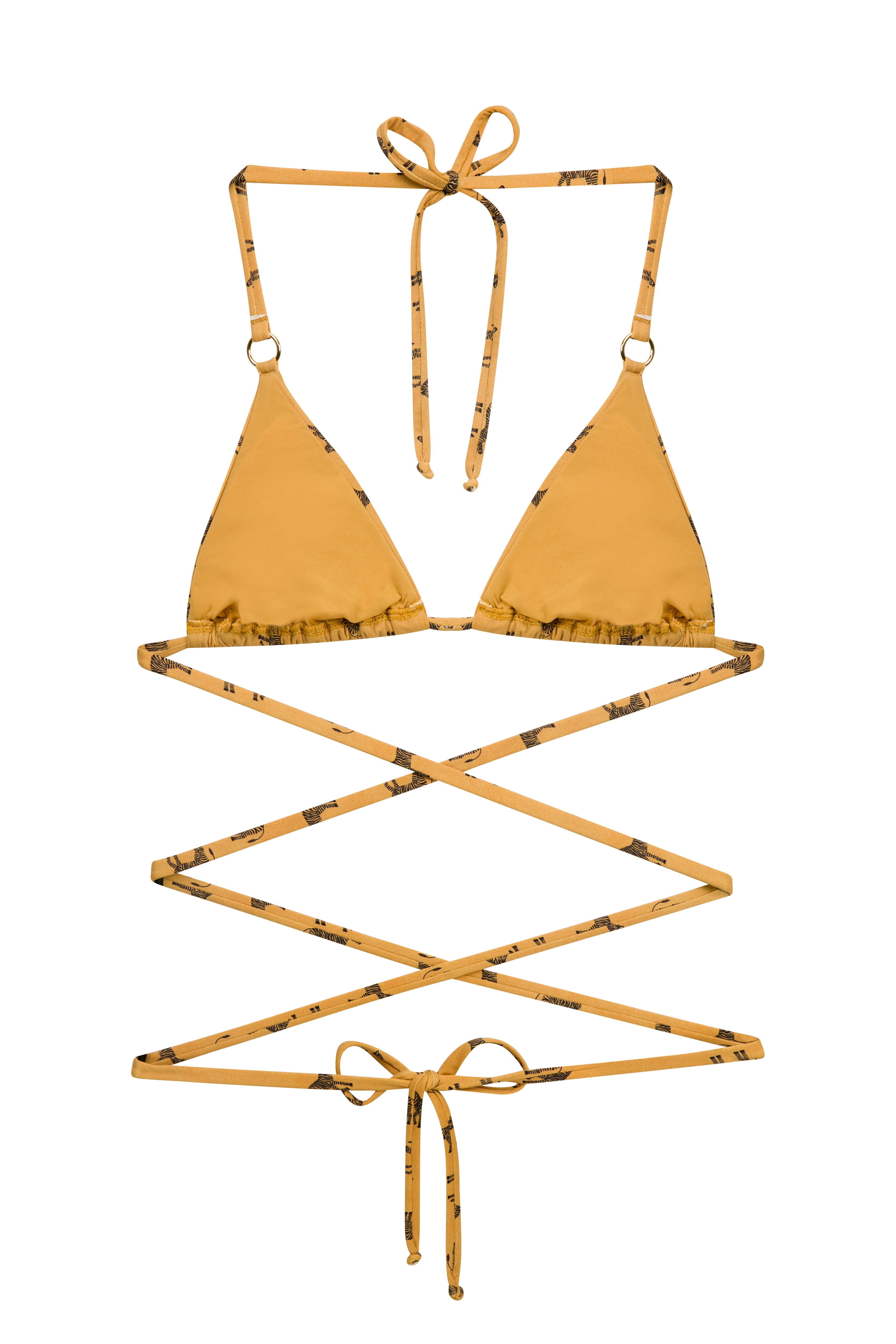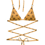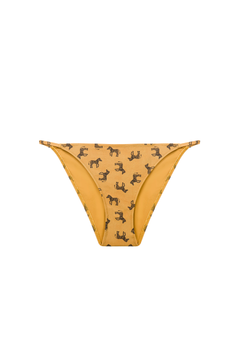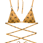 Embrace the call of the wild with the 'Wild at Heart' top. This piece is an embodiment of untamed elegance, featuring a classic triangle cut adorned with horse motifs that trot across a canvas of golden sand. The hardware detail adds a touch of refined adventure, perfect for those who roam free in spirit and style.