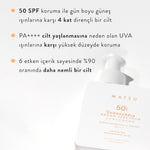 SPF 50 geniş korumalı güneş kremi, içeriğindeki Niacinamide, Hyaluronik asit ve Spirulina sayesinde cilt parlaklığını artırır ve nemlendirir. Klinik onaylı formül, cildi UVA ve UVB ışınlarından koruyarak güneşe karşı geniş spektrumlu bir savunma sunar.