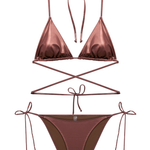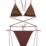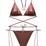 Embrace the allure with the "Too Hot to Handle" bikini set. This stunning ensemble features a radiant, smooth satin finish in a captivating brown hue, designed to shimmer under the sun. The non-adjustable ties of the bikini top and bottom ensure a sleek and uninterrupted silhouette, emphasizing effortless elegance. With its minimalist design and golden accents, this set seamlessly combines sophistication and comfort, making it perfect for those who appreciate a chic, understated beach look.