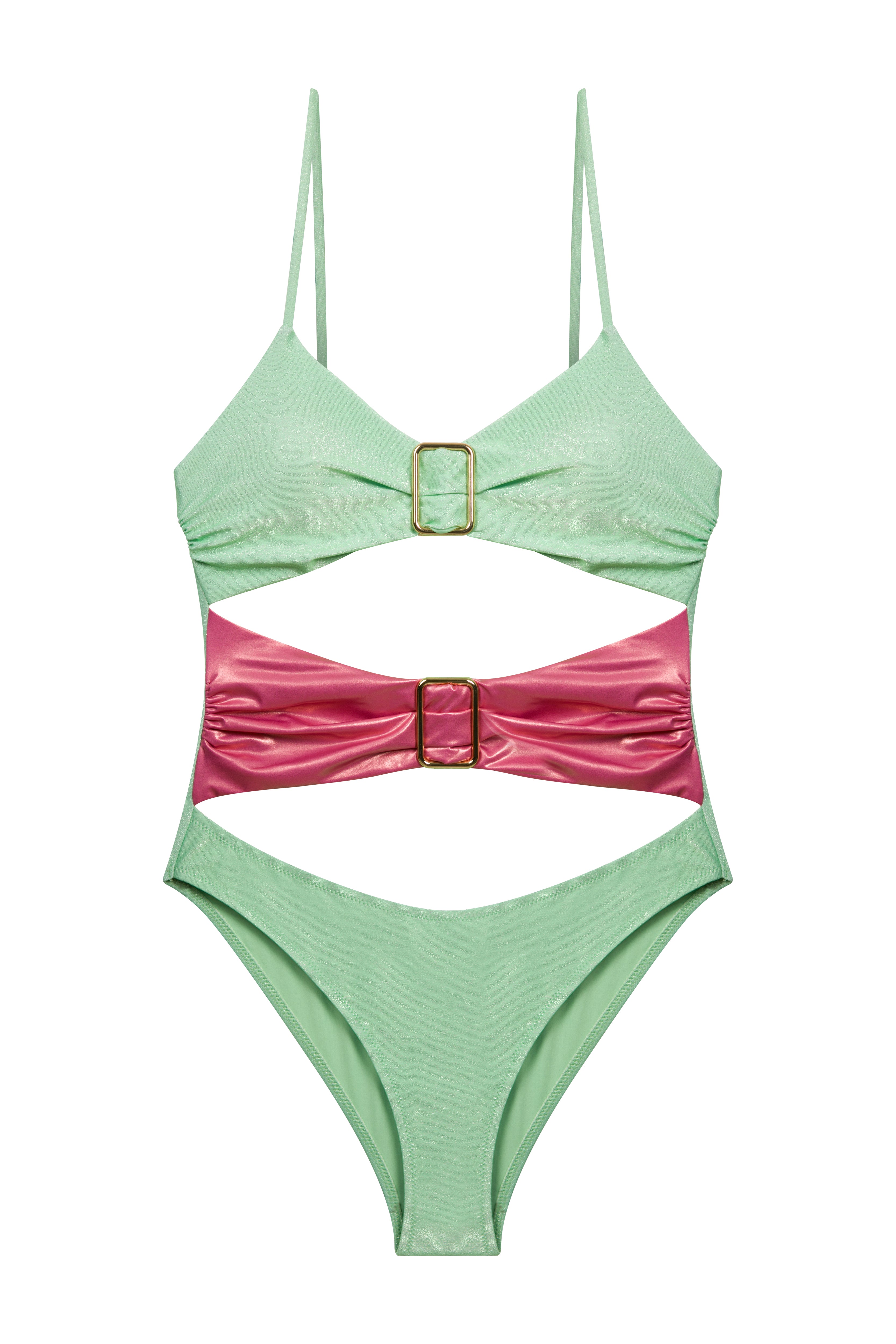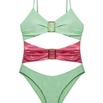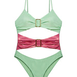 The "Beautiful Chaos" swimsuit is a bold statement in the symphony of swimwear. With its striking lime green hue and a contrasting pink belt, it captures the essence of a vivid summer. The suit features a unique cut-out design that playfully reveals a hint of skin, while the square buckles add a touch of unexpected geometry. This piece is not just about its visual appeal, but also about the intricate balance of design elements that come together in a seemingly chaotic, yet perfectly harmonious fashion. It's a celebration of the unexpected twists that define beauty, making it an essential for those who dance to the beat of their own drum and embrace the dynamism of life.