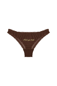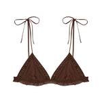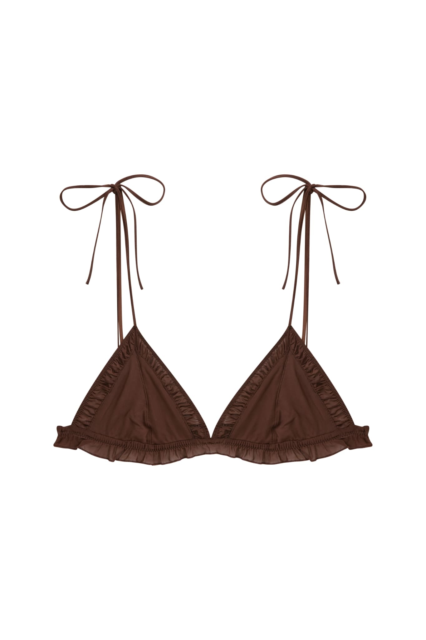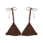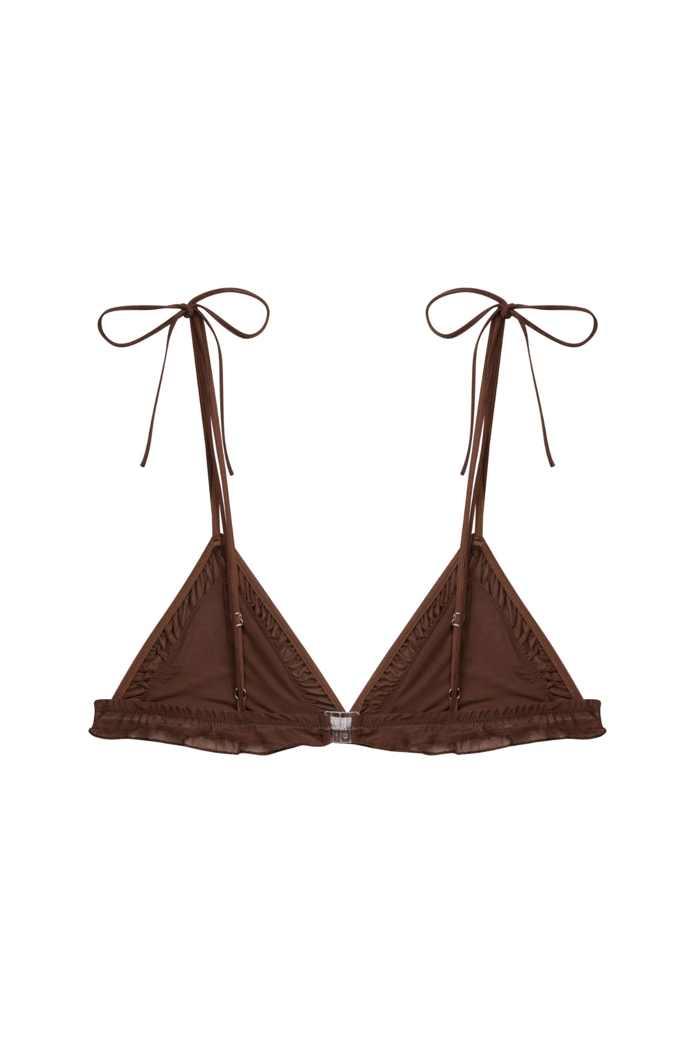 With its clean lines and natural elegance, this brown sheer tulle bralette is designed for lightweight comfort and effortless style. The soft, breathable tulle fabric feels gentle on the skin, while adjustable tie straps allow a customizable fit. Subtle ruffle trim along the hem adds a delicate, feminine touch.