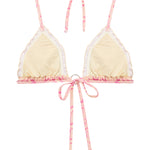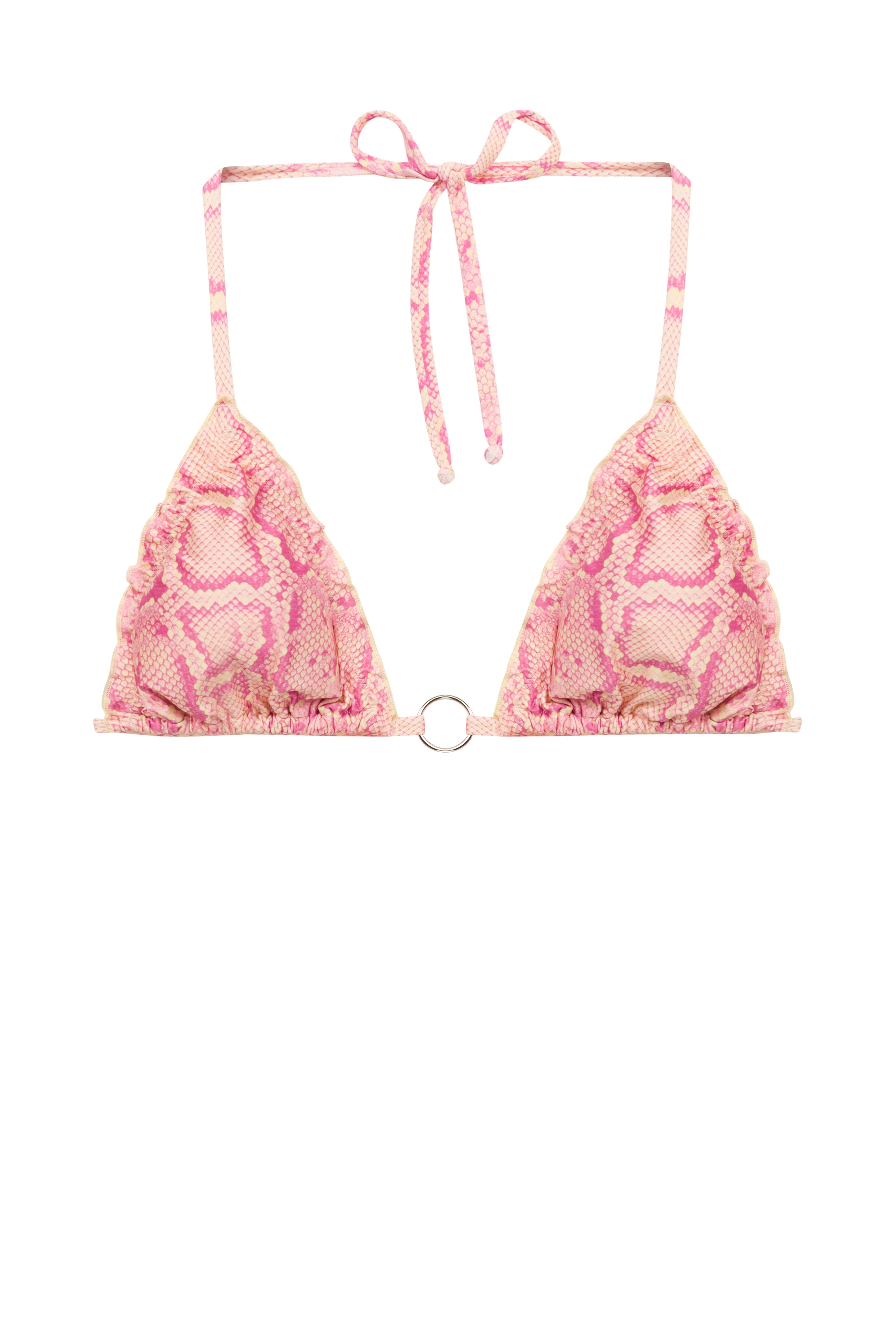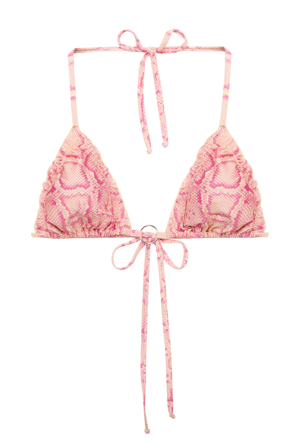 Dive into a world of sweet delight with the 'Pinktastic' top. This piece radiates with the exuberance of its pink snake print, accentuated with playful frills. The unique circle detail at the center connects the soft triangle cups, which gracefully sculpt a flattering silhouette. It's a jubilant blend of fun and flirty, crafted for those who carry a touch of whimsy wherever they go.